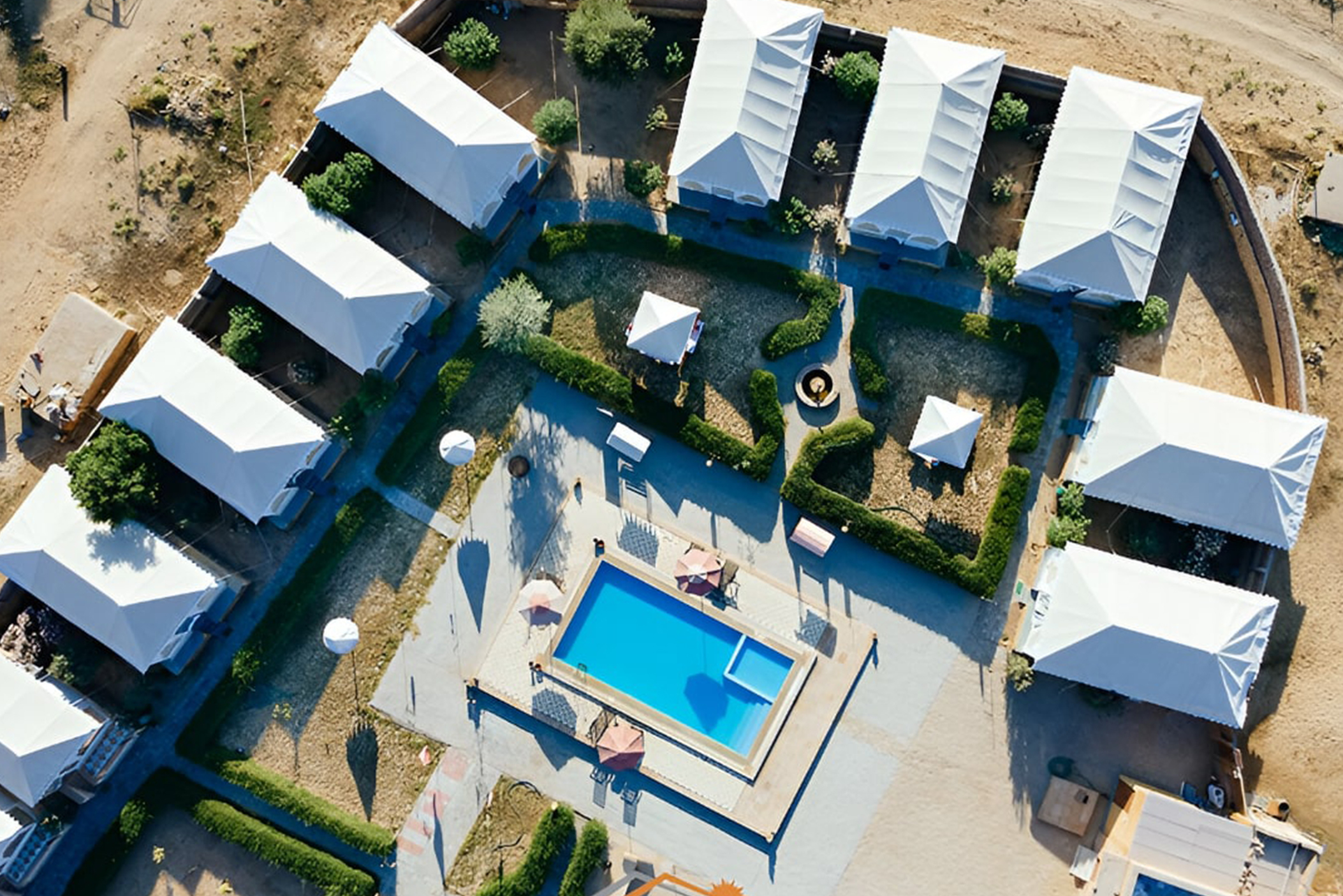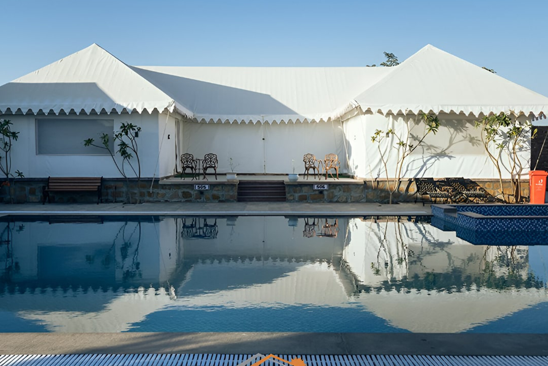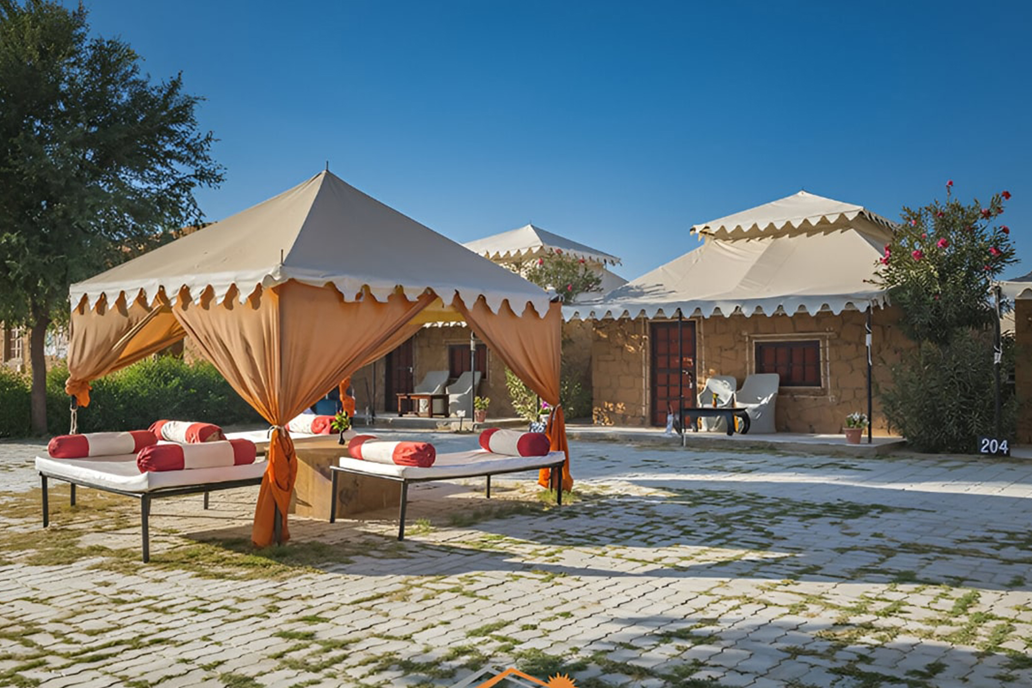 The Camps and Safaris Captures the luxurious nostalgia of a bygone age of the Maharaja's Safari and Shikar camps, combined with innovative design demonstrating many of the skills and crafts of Marwar. The camp consists of tents, each with verandah, bedroom and bathroom.
